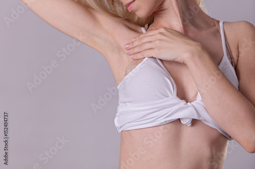 Young woman showing her Armpit after depilation, female underarm closeup, smooth clean skin . Waxing, laser hair removal treatment