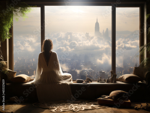 Young woman sitting on the window sill and looking at the big city. Generative AI