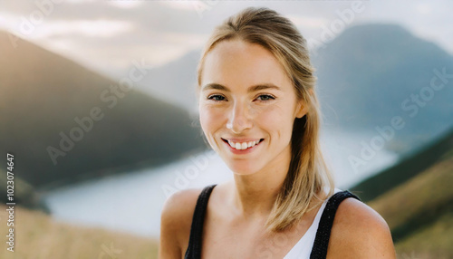 Young woman smiling in a natural landscape during golden hour with mountains and a lake in the background