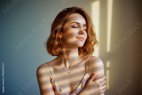 Young woman smiling in sunlight through blinds