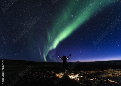 Young woman stretching arms upwards, starry sky, northern lights, aurora borealis, near Kolugljufur, Northwestern Region, Iceland, Europe