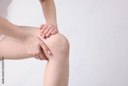 Young woman suffering from pain in knee on light grey background, closeup. Space for text