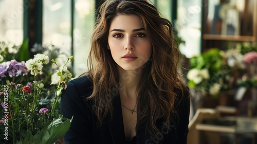 Young Woman Surrounded by Fresh Flowers in a Cafe