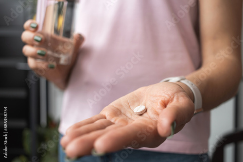 Young woman taking medicine pill, painkiller or antibiotic, holding glass of water
