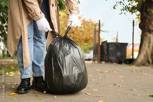 Young woman tying garbage bag on street in park, closeup