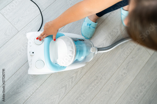 Young woman using vacuum cleaner at home cleaning