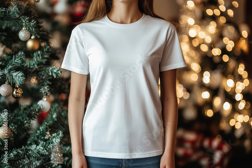 Young Woman wearing a blank white t-shirt mockup in front of a Christmas tree , girl tshirt for Christmas holidays compositions and home comfy in winter