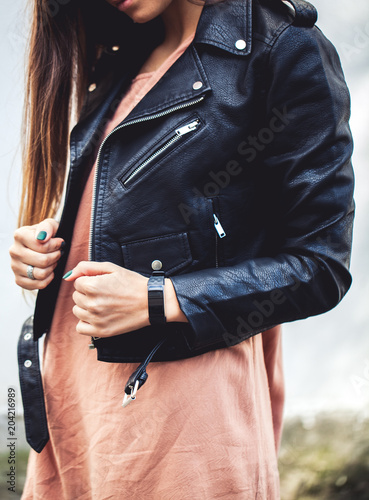 young woman wearing leather jacket, man, fashion, style