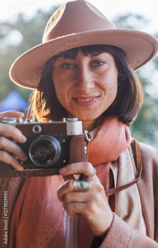 young woman with a film camera. Hipster tourist woman with camera. the girl takes photographs with a film camera. lifestyle concept. film camera. .