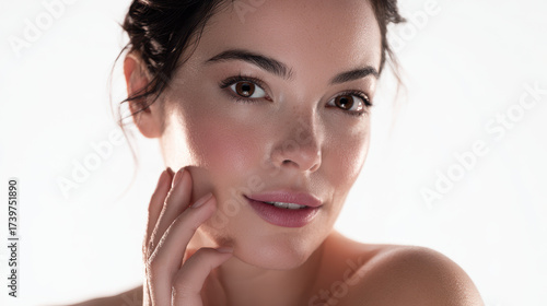 Young woman with clear skin touching face, natural beauty close up portrait, soft lighting highlights smooth complexion