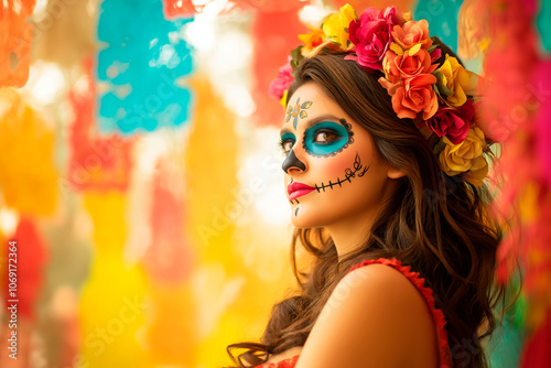 Young woman with Day of the Dead makeup, vibrant floral crown, and traditional dress, standing against a colorful background of Mexican papel picado decorations