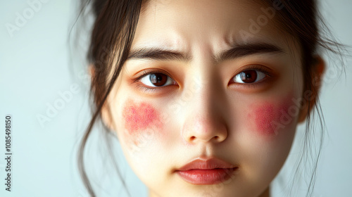 Young woman with flushed cheeks looks directly at camera. Concept of skincare or health issues. For editorial on skincare challenges.