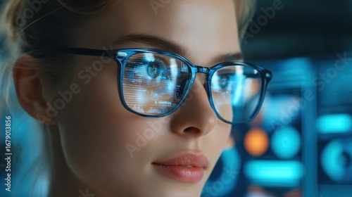 Young woman with glasses focused on digital interface, reflecting data and technology in modern workspace