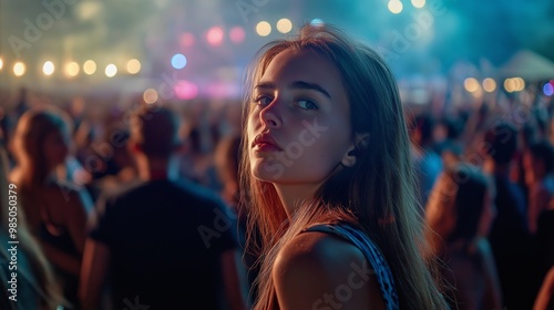 Young Woman with Long Hair at an Outdoor Night Concert, Surrounded by a Vibrant Crowd, Colorful Festival Lighting in the Background