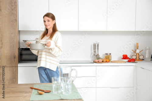 Young woman with prepared chicken soup in kitchen