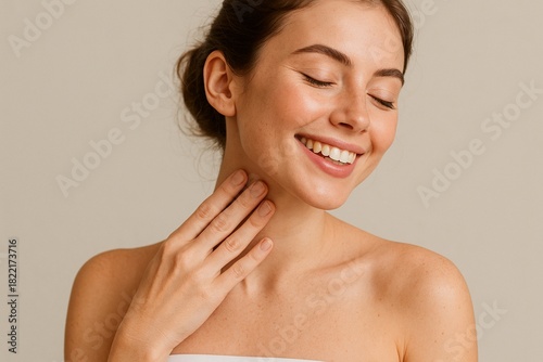 Young woman with serene smile, her eyes closed in moment of relaxation, gently touching neck. Selfcare and mindfulness, skincare and wellness. Caucasian female model. Importance of care of oneself