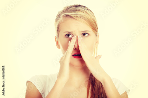 Young woman with sinus pressure pain