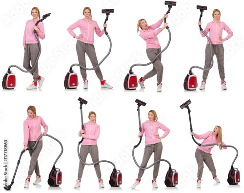 Young woman with vacuum cleaner on white