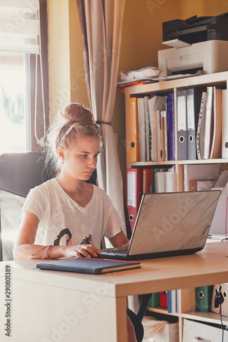 Young woman working at home, using portable computer, sitting at desk in home office. Candid people, real moments, authentic situations