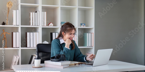 Young woman working on a laptop at a home office desk