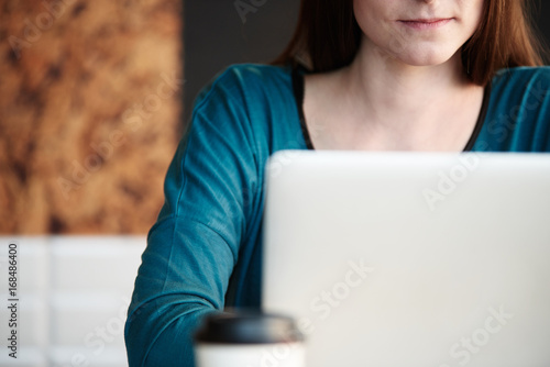 Young woman working on laptop at cafe