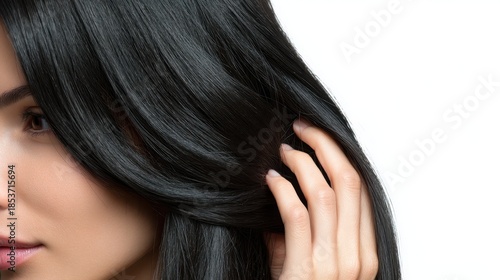Young woman's hand gently touching her beautiful, long, dark hair, showcasing healthy, shiny, and smooth locks, emphasizing beauty, wellness, and self care