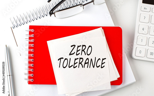 ZERO TOLERANCE word on the sticker on notepad with pen and calculator