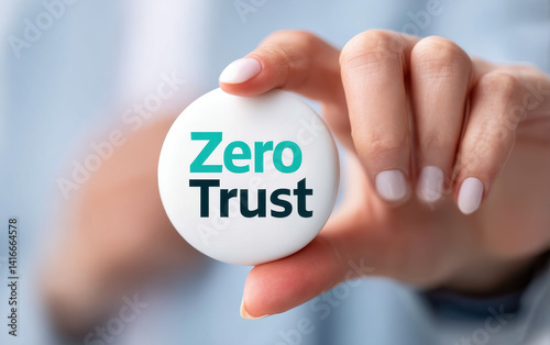 Zero Trust is concept that emphasizes security and verification digital environments. This captures hand holding round object with words Zero