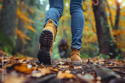 Zoomed in view of a hiking boot making contact with wet, colorful autumn leaves, showcasing the blend of human and nature