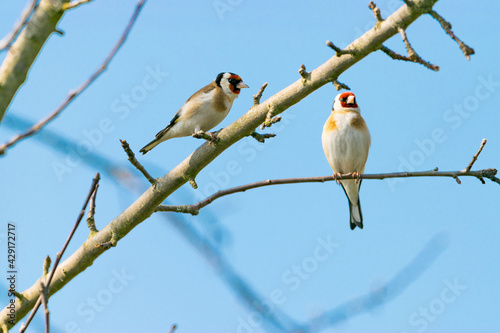 Zwei Stieglitze sitzen auf einem Ast im Apfelbaum. Stieglitze sind leicht an ihrem farbenprächtigen Federkleid zu erkennen. Sie sind meist in Gruppen unterwegs und fressen hauptsächlich Samen.
