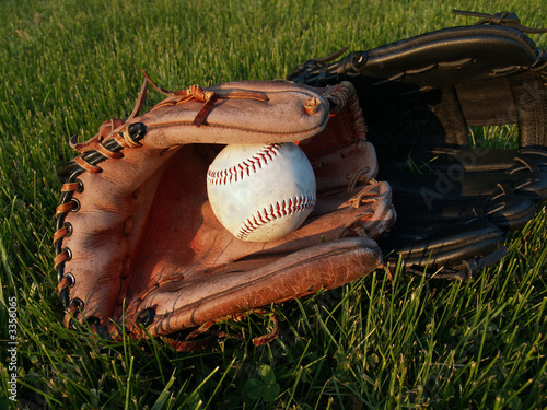 "baseball": adult and child gloves with ball