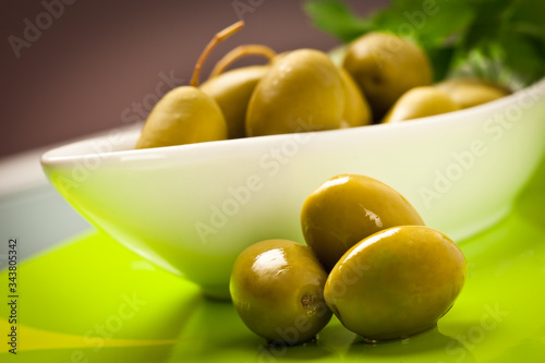 "beautiful Cerignola olives" in white bowl and green plate