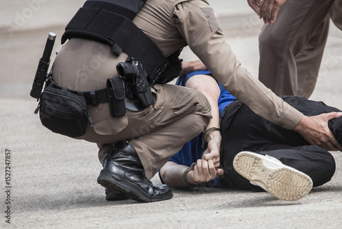 Police steel handcuffs,Police arrested,Professional police officer has to be very strong,Officer Arresting,"Police Catch the Culprit".