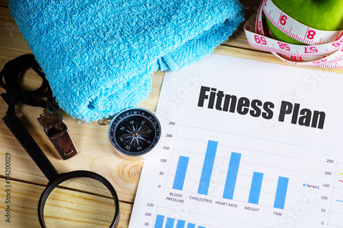 "Fitness Plan" text on paper with blue bar chart on wooden table with compass,magnifying glass, pen, towel, green apple with measurement tape, and whistles - fitness, diet and healthy concept