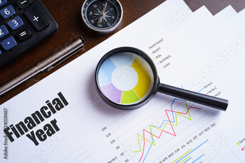 "Financial Year" text on paper sheet with magnifying glass on chart, dice, spectacles, pen, laptop and blue and yellow push pin on wooden table - business, banking, finance and investment concept