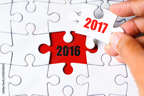 "2016" word on missing puzzle with a hand hold a piece of "2017" word puzzle want to complete it - business and finance concept