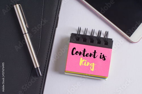 "Content is king" words on pink sticky notes with fountain pen, diary and smartphone on white background - business and finance concept