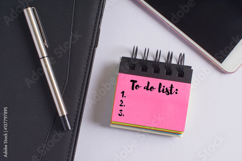 "To do list" words on pink sticky notes with fountain pen, diary and smartphone on white background - business and finance concept