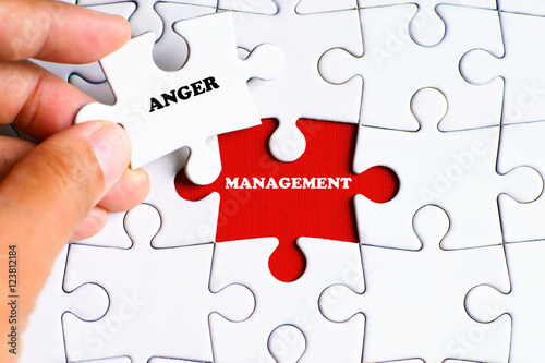 "MANAGEMENT" word on missing puzzle with a hand hold a piece of "ANGER" word puzzle want to complete it - business and finance concept