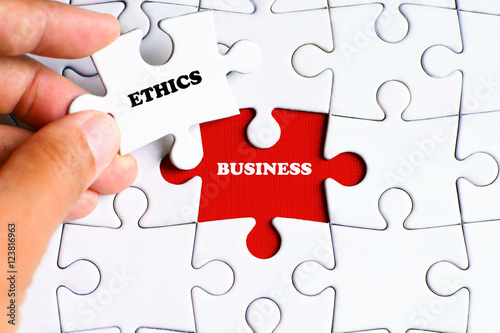 "BUSINESS" word on missing puzzle with a hand hold a piece of "ETHICS" word puzzle want to complete it - business and finance concept