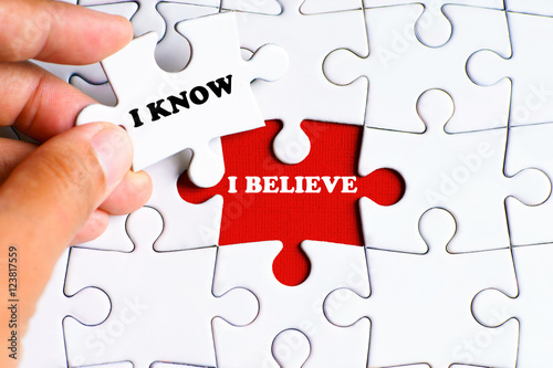 "I BELIEVE" word on missing puzzle with a hand hold a piece of "I KNOW" word puzzle want to complete it - business and finance concept