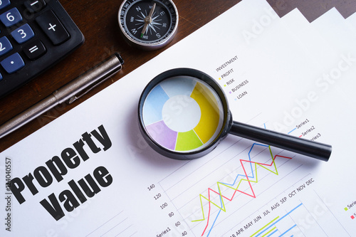 "Property Value" text on paper sheet with magnifying glass on chart, dice, spectacles, pen, laptop and blue and yellow push pin on wooden table - business, banking, finance and investment concept