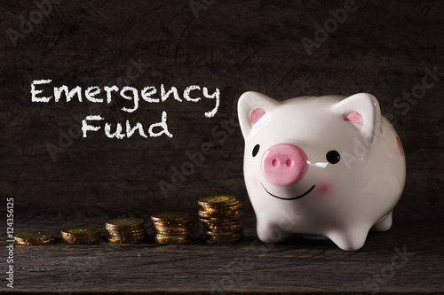 "Emergency fund" words with Piggy bank and stack of golden money increased with wooden background - saving, finance and business concept