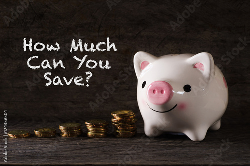 "How much can you save?" words with Piggy bank and stack of golden money increased with wooden background - saving, finance and business concept