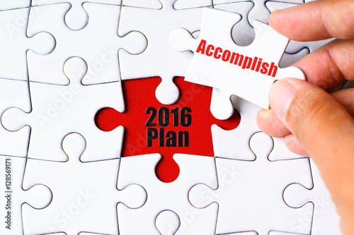 "2016 Plan" word on missing puzzle with a hand hold a piece of "Accomplish" word puzzle want to complete it - business, new year and finance concept
