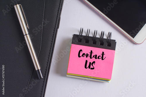 "Contact us" words on pink sticky notes with fountain pen, diary and smartphone on white background - business and finance concept
