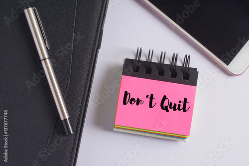 "Don't quit" words on pink sticky notes with fountain pen, diary and smartphone on white background - business and finance concept