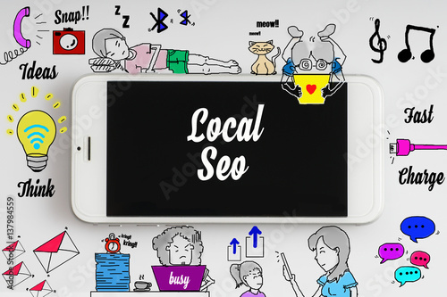 "Local seo" words on smartphone with doodle and social media icon - internet, social, marketing and business concept