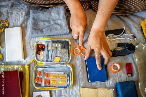 Equipment check - woman testing headlamp while assembling emergency go-bag