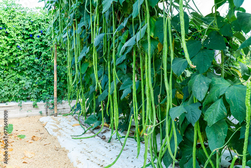 Green yardlong bean or cowpea agriculture in the garden background. Yard long bean or cow pea plantation at farm